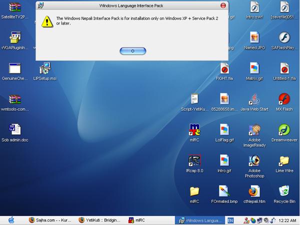 I already removed it, didnt like it at all. all confusing nepali words. english ma habit bhaisakecha. Thees KTA Microsoft will automatically validate your system. if you have not upgraded it to sp2, upgrade it first then install nepali font interface package. it should work.