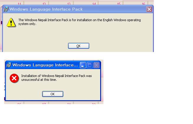 i wish i could do it!!. i dont know wat happen, but its not letting me install. i hav windows XP but its says u need windows xp + later... anywayz, aswin jyu...may be u can help me here!!. here is my screen shot. And once i click OK, it says: the installation of nepali windows is unsccessfull :( के आई लागो, हरि सरणम्। आज सबेरै बिहान कालो बिरालोले बाटा काट्या थो, तै भेर होला. मोरि जाओस् तो बिरालो।