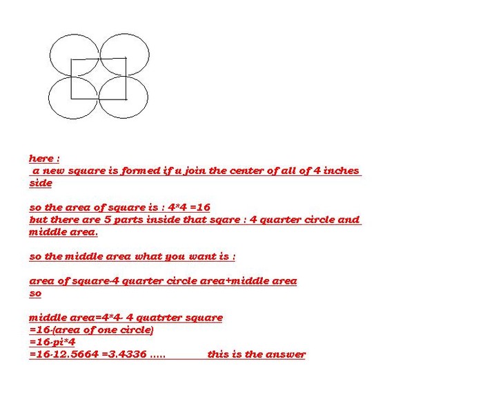 WE ARE INTERESTED IN the MIDDLE AREA, by subtracting the enclosed area of 1/4th circles. which will be: 16-3.14 or approximately 12.86.