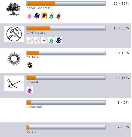 Hi Guys, I have created a Poll on Who Might win the CA Election in Nepal or party of your preference. This is also my course requirement. Please,Cast your VOTE here..and Help me prepare a good article. http://www.uploadtherevolution.blogspot.comThanking you in Advance.