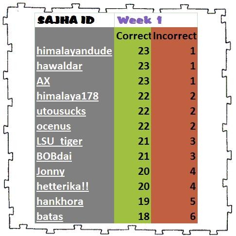 Hmm... The College Football Action is back in sajha eh?? ...GREAT!! LSU Bro: Thanks for taking the initiative. Himalaya Bro, Hetterika Bro, Ocenus Bro, AX Bro, Himalayan Bro, KC Bro and all the participants: Wats up with ya'll!! Here's my pick: No. 2 LSU at Mississippi St., 8 p.m. ---LSU No. 10 Louisville vs. Murray St., 7:30 p.m.---Louisville No. 16 Rutgers vs. Buffalo, 7 p.m. ---Rutgers No. 24 Boise St. vs. Weber St., 9 p.m.-- Boise state No. 1 Southern Cal vs. Idaho, 10:15 p.m.---USC No. 3 West Virginia vs. W. Michigan, 3:30 p.m. --- West Virginia No. 4 Texas vs. Arkansas St., 7 p.m. --- Texas No. 5 Michigan vs. Appalachian St., Noon --- Michigan No. 6 Florida vs. W. Kentucky, 12:30 p.m.-- Florida No. 7 Wisconsin vs. Washington St., 3:30 p.m. --- Wisconsin No. 8 Oklahoma vs. North Texas, 7 p.m. --- Oklahoma No. 9 Virginia Tech vs. East Carolina, Noon --- Virginia Tech No. 11 Ohio St. vs. Youngstown St., Noon --- Ohio State No. 12 California vs. No. 15 Tennessee, 8 p.m. ---- Cal No. 13 Georgia vs. Oklahoma State, 6:45 p.m.---OSU No. 14 UCLA at Stanford, 3:30 p.m. ----UCLA No. 17 Penn St. vs. Fla. International, Noon ---- Penn State No. 18 Auburn vs. Kansas St., 7:45 p.m. ---Auburn No. 20 Nebraska vs. Nevada, 3:30 p.m. ----Nebraska No. 21 Arkansas vs. Troy, 7 p.m. ----Arkansas No. 22 TCU vs. Baylor, 6 p.m. ----TCU No. 23 Hawaii vs. N. Colorado, 12:05 a.m. Hawaii No. 25 Texas A&M vs. Montana St., 7 p.m. --- Texas A&M No. 19 Florida St. at Clemson, 8 p.m.--Florida St. GO HUSKERS!