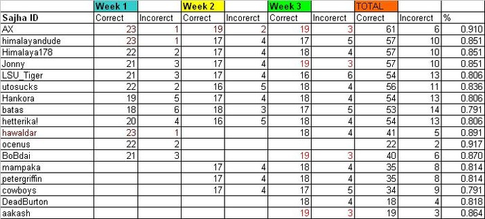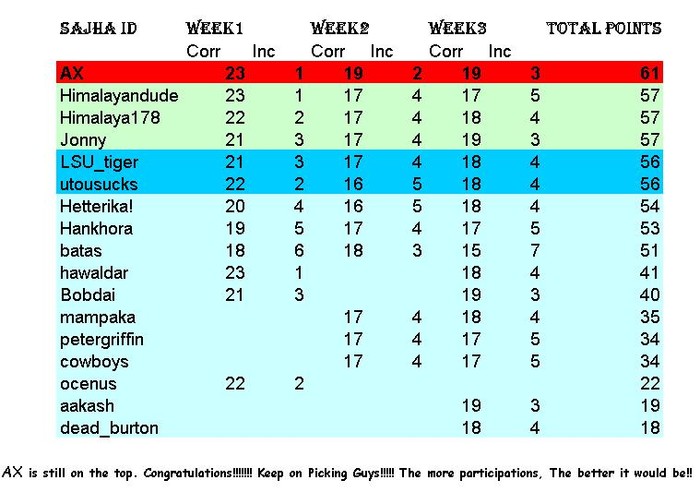 here's the week 3 results... Vols fans needa do lil' better job picking games :=) Good Luck All
