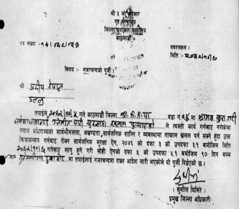 . . End of Autocracy.. This is the begining of end of Autocracy in Nepal. Time has come to countdown the left-over days. I think there is only maximum 333 days left to find a safe passage to escape from this situation. Today is the second day of 333 days left. Count down 332 History of all dictatorship in the past in this world shows, at last they all send the letters like this to the democratic leaders. Because they cannot do anything else in this vaccum flask. Recently Opposition leaders from orange revolution in Ukaraine got letters from the last government with almost the same content. It�w worth fighting. Democracy wins at last. Let�s start demos also in overseas to help our friends in our home country.