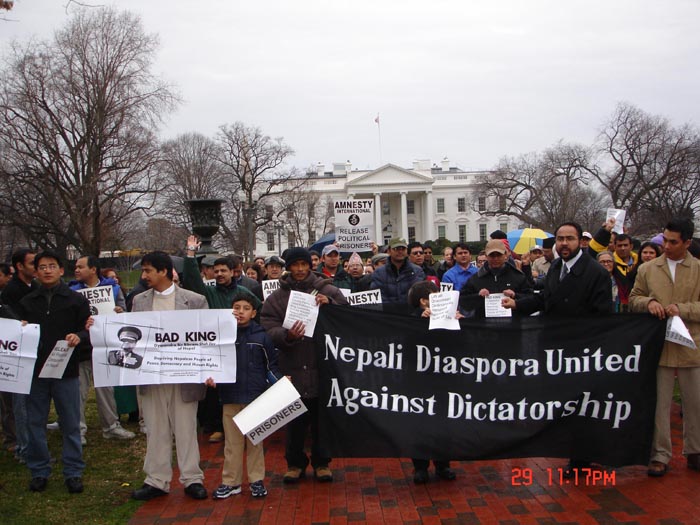 Democracy loving Nepali Diaspora in various cities of the US and other countries are organizing rallies to observe Feb 1 as a 'Black Day". In 'Nepal Democracy Google Group', we have had discussion regarding rallies at the following places, Washington DC New York San Francisco, CA Phoenix, AZ Gainesville, FL Cleveland, OH Columbia, SC London, UK Hong Kong Washington DC organized the rally yesterday. Some 200-250 people attended the rally. Slogans demanding Constituent Assembly and anti-monarchy slogans including the most popular one, "Gyane Chor, Desh Chhod", speeches and poetry recital characterized the rally. Gainesville also had the rally yesterday. About a hundred people attended it. New York will have a rally on the 1st of Feb in front of UN Headquarter (Ralph Bounch Park, 3:00 pm ). London will be organizing a rally in front of the Parliament on Feb 1. Other cities are also having rallies on Feb 1. *** *** *** Although Feb 1 is being called a "black day", the fact is that it was the brightest day in terms of opening our eyes regarding monarchy. I would call it an "eye opening day" instead. *** *** *** A picture from DC rally organized yesterday