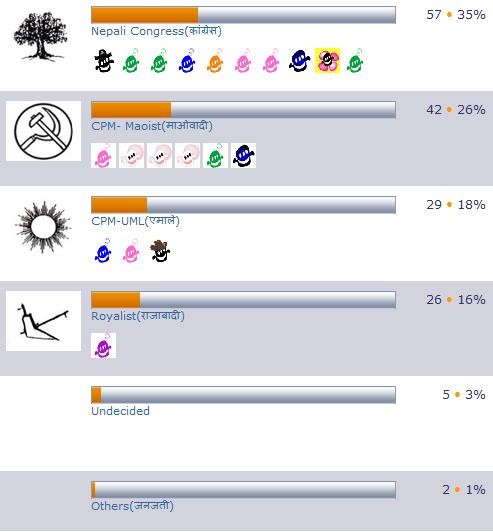 Namaste, Could you please remove election symbol "Halo" from the royalist. This symbol is for RPP (of Pashupati SJBR) not RPP-Nepal. RPP's election manifesto does not call for establishment of monarchy, RPP-Nepal does. So please change the symbol, before you loose your credibility to perform such surveys. Please read all facts before posting such things. This forum is a significant information. Please be a little more careful. Peace and Enjoy. -sujanKS