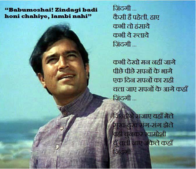 "Soon after I was being cast opposite him in 'Anand'. This was like a miracle, God's own blessing and one that gave me 'reverse respect'. The moment that anyone came to know that I was working with THE Rajesh Khanna, my importance grew. And I gloated in its wake. During the breaks in the shooting of the film I would return to Delhi and gleefully describe the scenes and dialogues of the film, as also its music to all that I met - and I met many during that time ! There were no CD's then, just the spooled tapes, and getting Hrishi da to part with one such for me, was an exercise in futility. But I was able to get one and 'kahin dur jab din dhal jaae ..' played endlessly on my very repair stricken tape recorder."